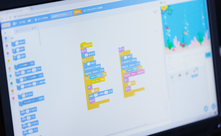 Scratchは、学校やほかの教室でもよく使われているソフトなので、ご存知の方も多いかもしれません。ブロックを組み立てるだけなので簡単そうに見えますが、これが意外と難しく…。適当に組み立てると、キャラクターなどが意図しない動きをしてしまうのです。当教室では、うまくいってもいかなくても「なぜそうなったのか」を説明してもらいますが、順序立てて考える力を身につけられるよう指導しますので、ご安心ください。
